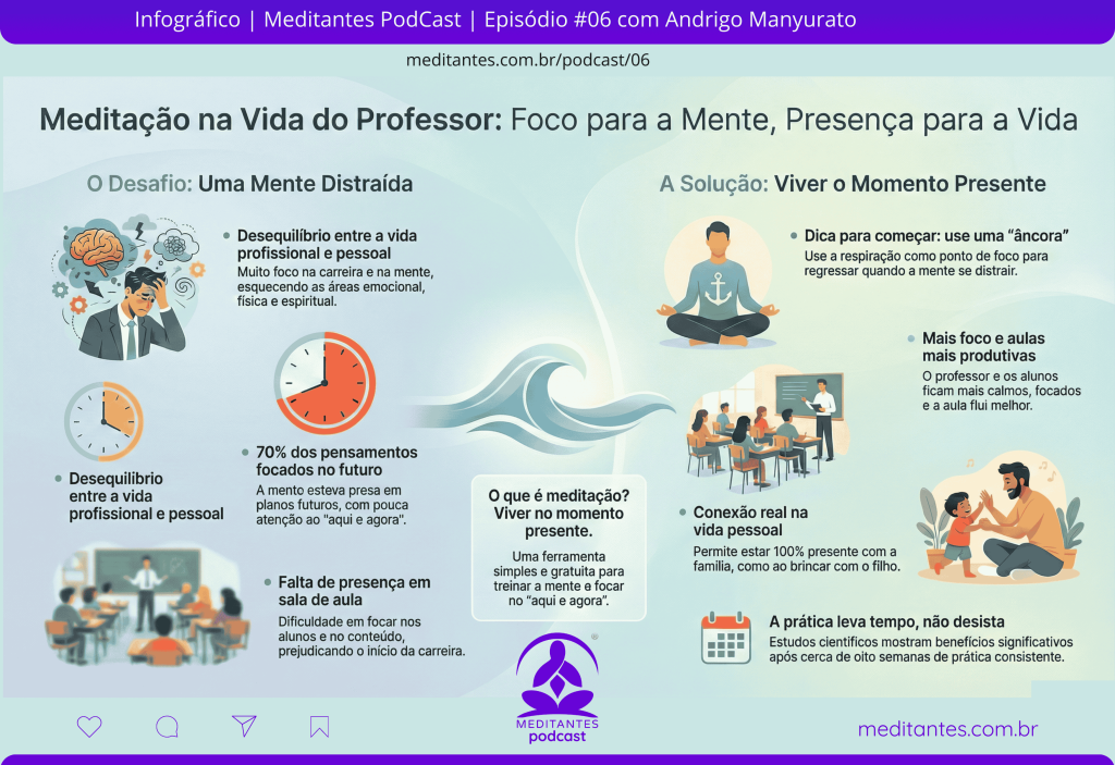 Manyurato compartilha sua trajetória pessoal, revelando como a prática auxiliou no gerenciamento do estresse e na conquista do foco no momento presente, superando a ansiedade comum à carreira docente. O convidado descreve como implementa técnicas meditativas em suas aulas de estatística na UNESC, observando melhorias significativas na concentração e no bem-estar dos estudantes.