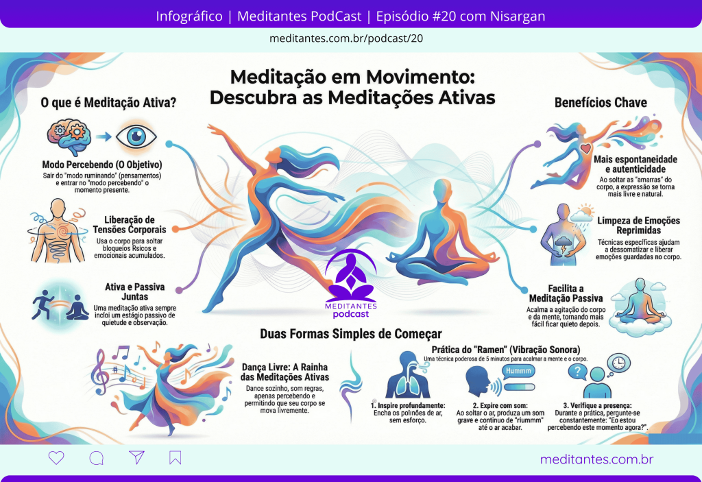 O diálogo explora a meditação ativa, técnica que combina movimentos corporais e sons para liberar tensões físicas e bloqueios emocionais acumulados.