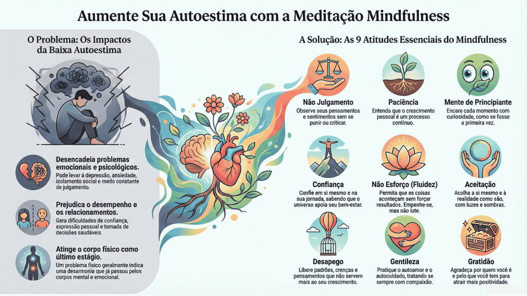 📝 Ao praticarmos as atitudes de meditação, desenvolvemos uma maior consciência de nossos pensamentos, emoções e reações, permitindo-nos observar a nós mesmos com mais compaixão e aceitação. Essa prática de presença plena não só fortalece nossa capacidade de viver no momento presente, mas também cura e eleva a nossa autoestima, ao nos conectar com nossa verdadeira essência. Com o tempo, ao cultivar o mindfulness, passamos a perceber nosso valor intrínseco, liberando-nos das autocríticas e abraçando a confiança, a autocompreensão e a autenticidade.