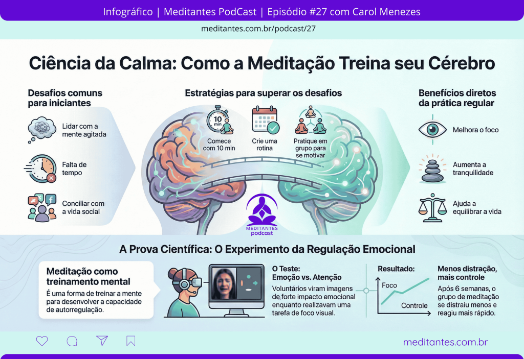 Este conteúdo apresenta uma entrevista com a psicóloga e pesquisadora Carol Menezes no “Meditantes PodCast”, focada na relação científica entre meditação e psicologia.